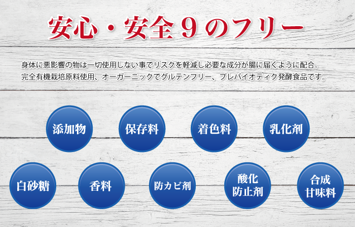 原材料と製造において徹底した無添加ポリシーを採用しています。その証として、次の 9つの成分を一切使用しない「9フリー」 を実現。